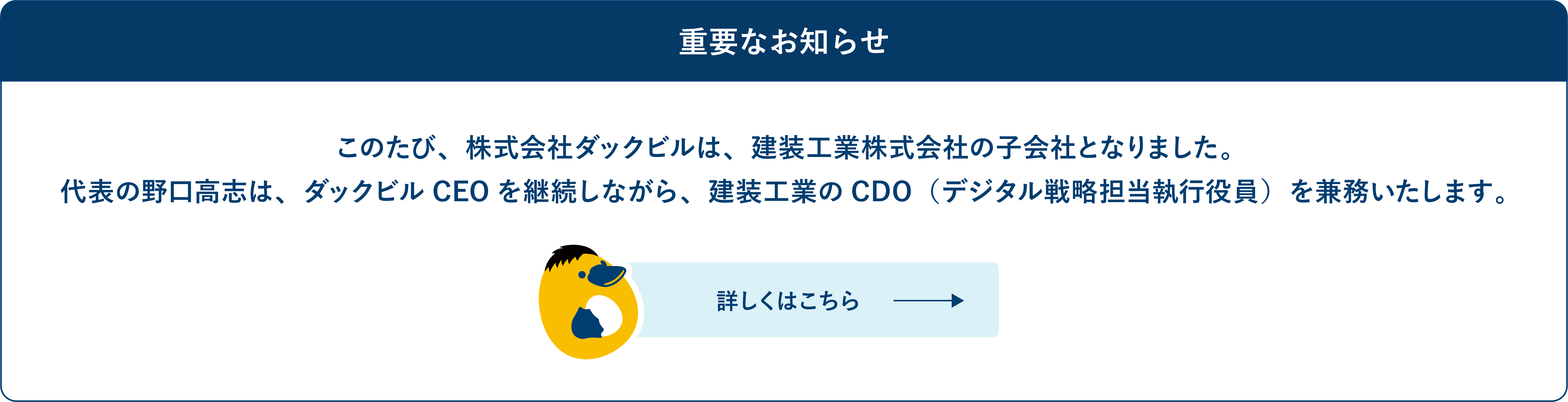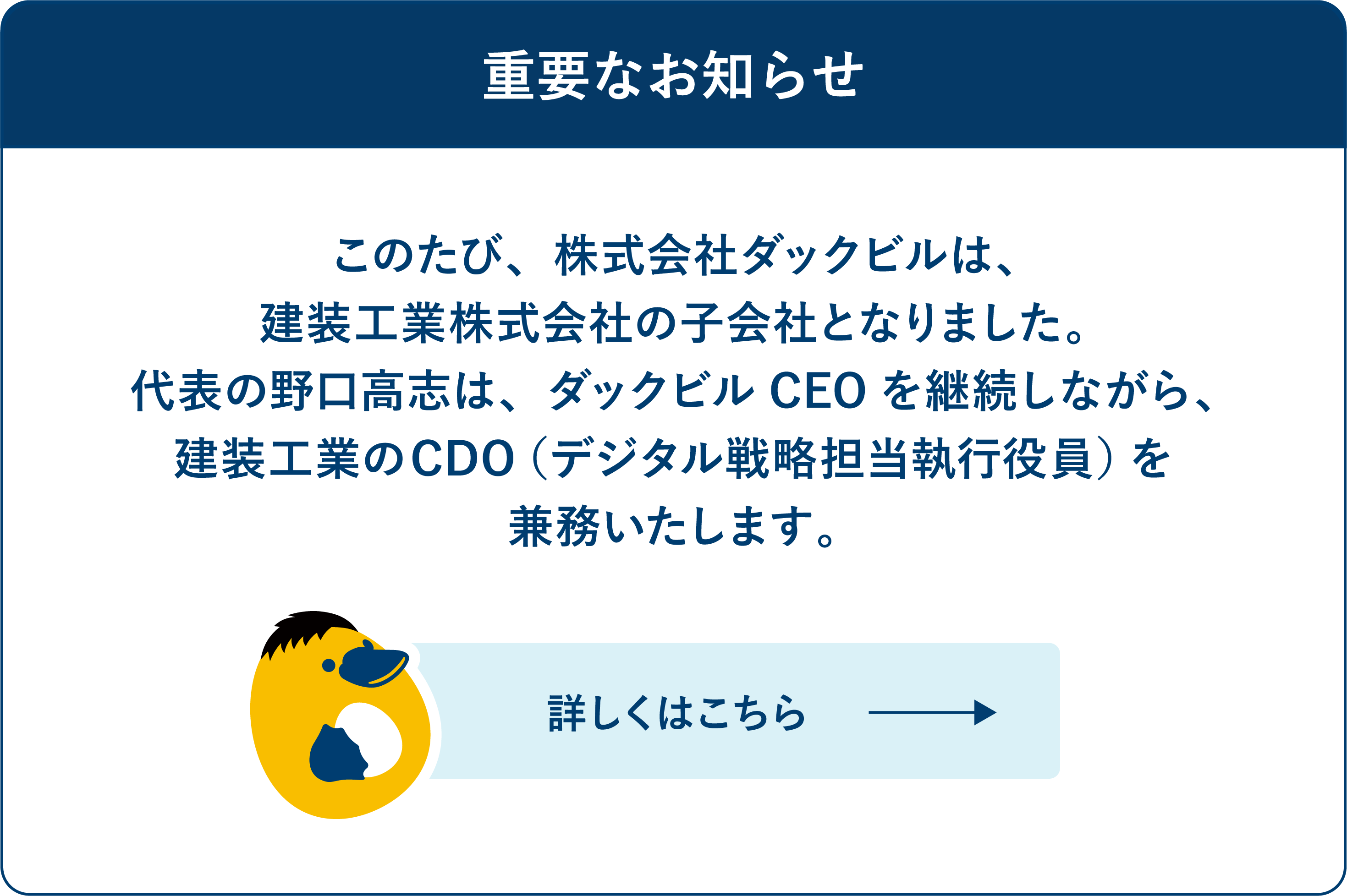 株式会社ダックビルは建装工業株式会社の子会社になりました。ダックビルCEO野口高志は建装工業デジタル戦略担当執行役員(CDO)を兼務します。