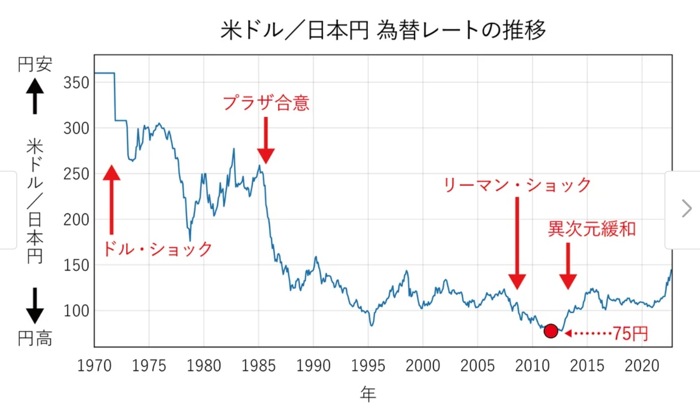 50年分のドル円為替レートをグラフにするとこうなる。今日1ドルはいよいよ160円を超えた。2012年ごろは75円だったわけだから円の価値は10年で半減したということになります。